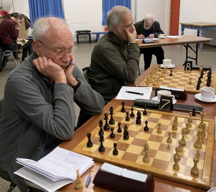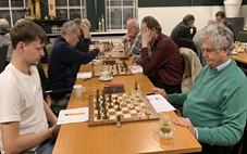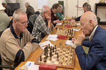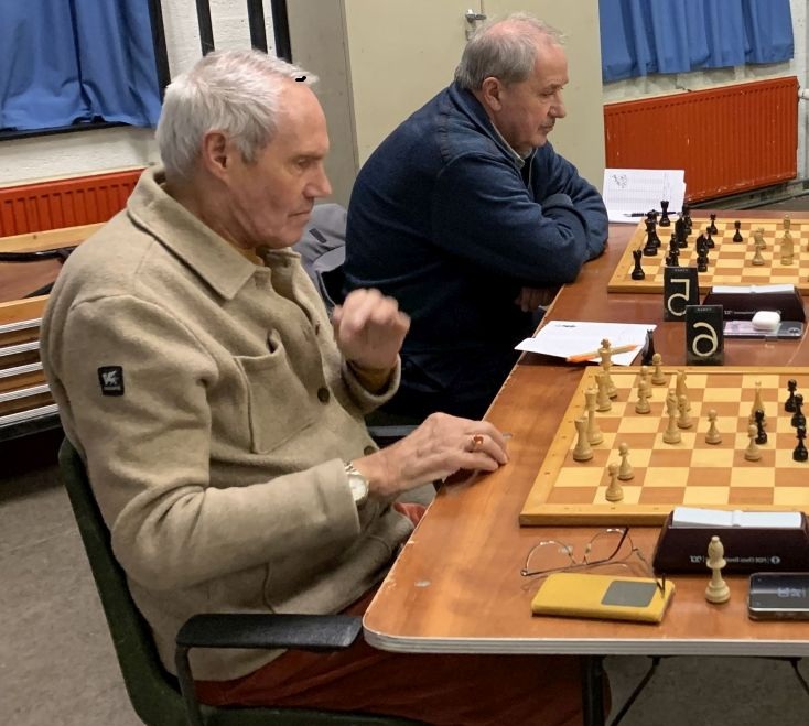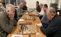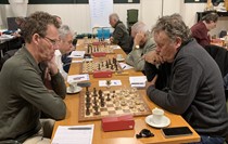Zelf speelde ik aan bord 6 met wit een solide partij tegen een gedegen tegenstander. Aan aanvallen kwam ik nauwelijks toe maar mijn verdediging bleek niet te slechten met ook hier remise als resultaat. -> 2- 1 Een goed eindresultaat bleek zeker mogelijk daar op de overige borden de stellingen op dat moment gelijk waren of zelfs iets beter... In zo'n betere stelling met torens en een paard en een (vrij)pion meer op de c-lijn, zette Vincent aan bord 8 zijn toren verkeerd neer. In plaats van b7 op b8. Zijn tegenstander accepteerde dankbaar dit onverwachte presentje. Vincent restte slechts zijn koning neer te leggen... -> 2-2Peter aan bord 5 met zwart had een zware dobber aan zijn tegenstander. Lange tijd ging de boeiende en spannende strijd gelijk op maar in het eindspel gaf het witte paard ver opgerukt in de vijandelijke stelling de doorslag. Een aanval met paard en toren op pion g7 verdedigd door slechts de dame. Hier maakte Peter de fout door zijn toren naar g5 te spelen. Wit sloeg deze toren en de partij was over. -> 2-3