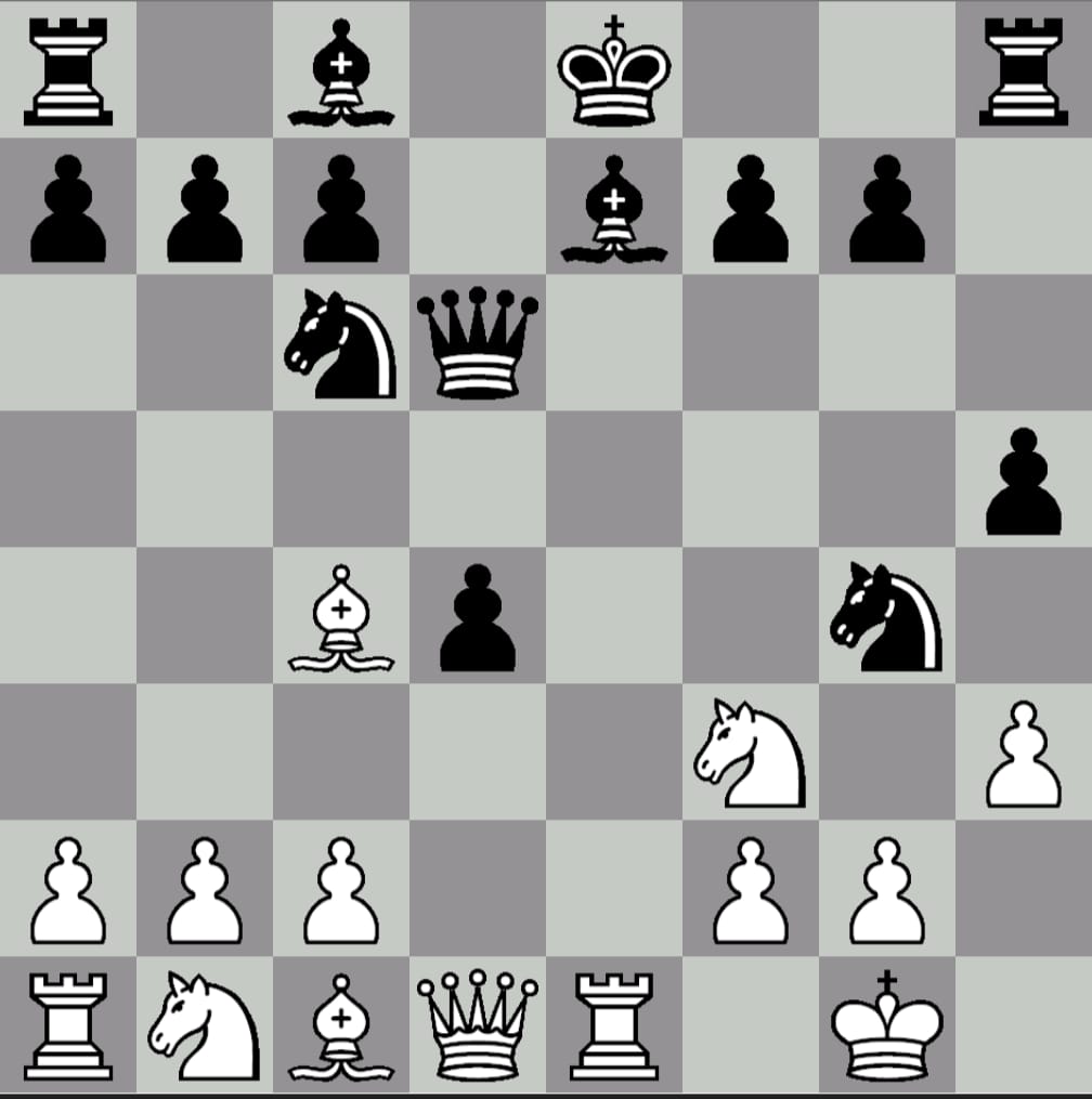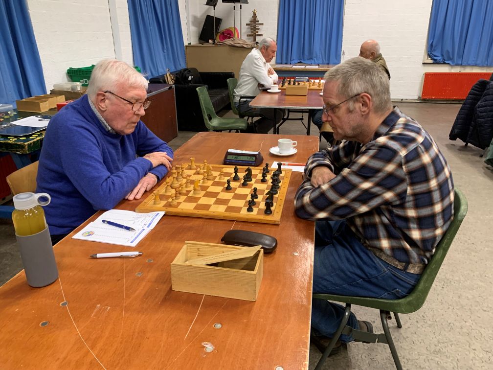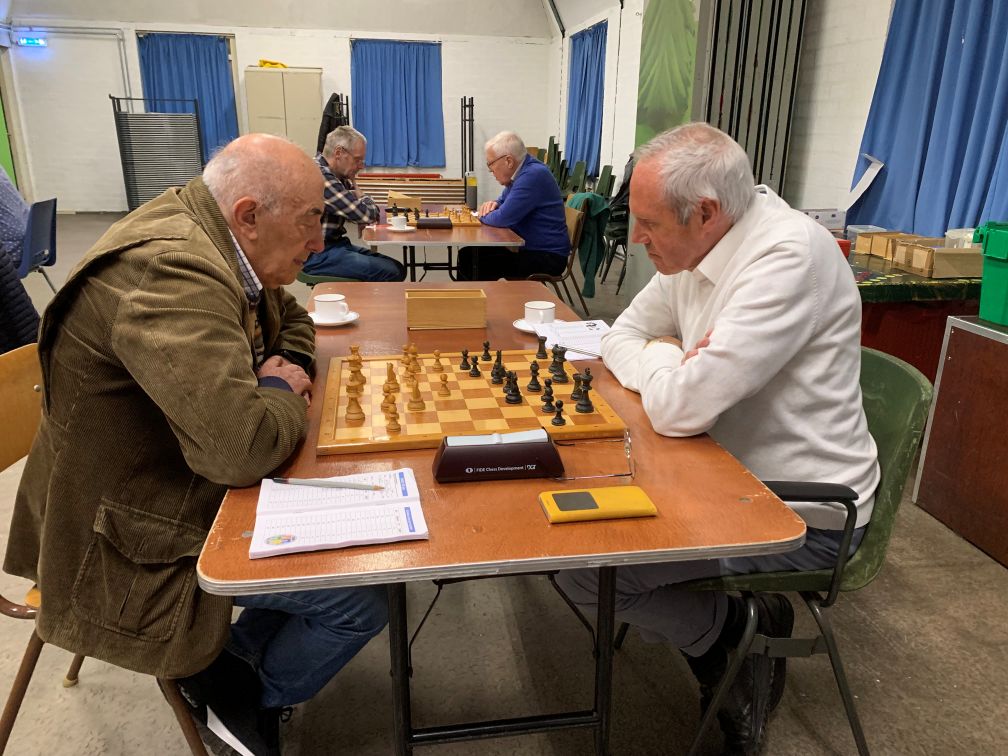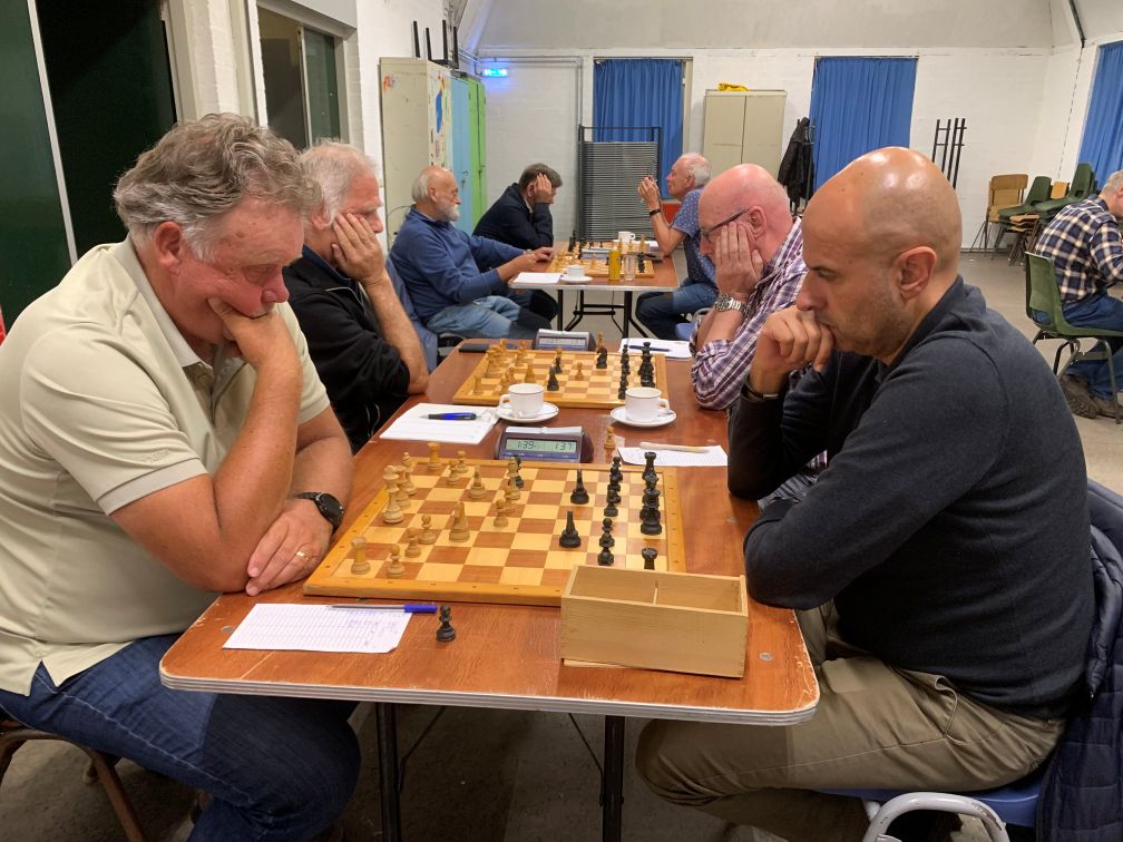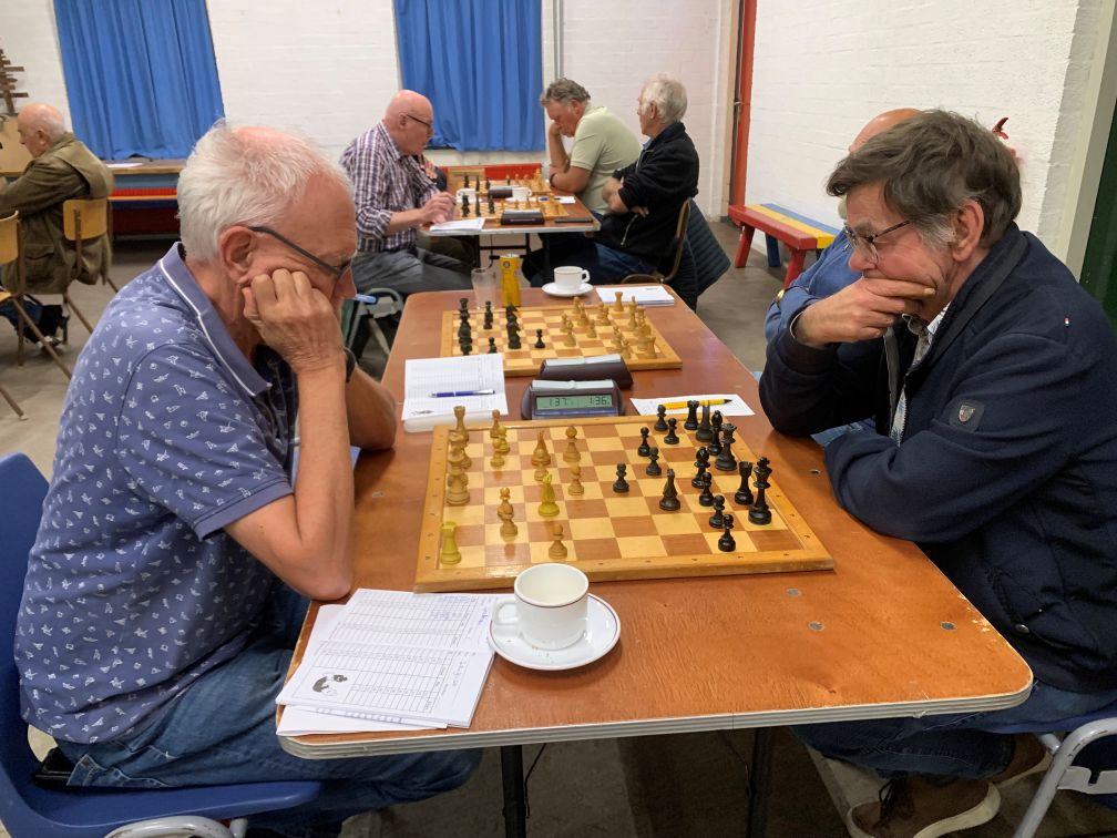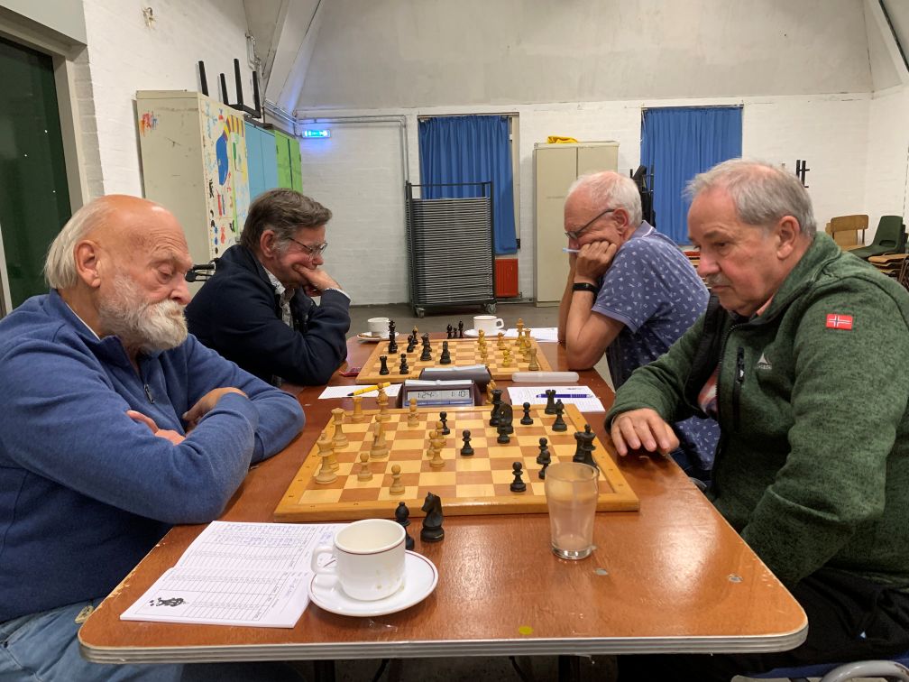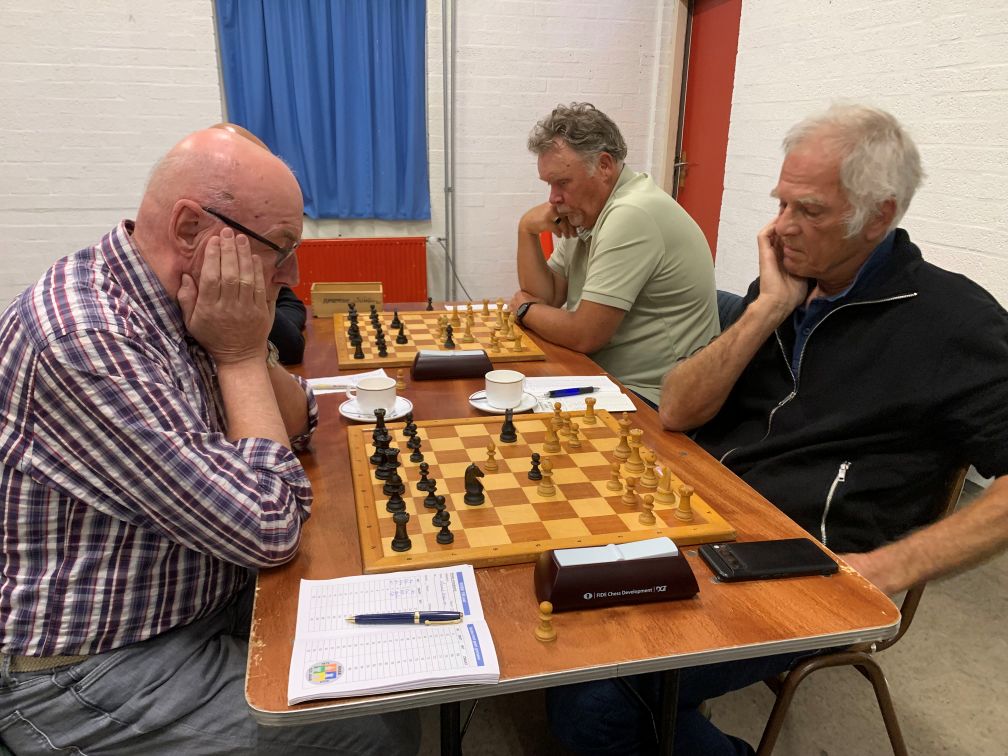 En als laatste speelde Willem Hessels tegen ondergetekende. Na een gelijk opgaande opening brandde in het middenspel de strijd los. Ik kon aftrekschaak geven door mijn zwarte pion door te schuiven van d4 naar d3. Het paard op e2 was hiervan het slachtoffer. Wit trok hierna vol ten aanval, offerde diverse stukken om met zijn dame te kunnen toeslaan. Maar ik kon de dames afruilen. Voor wit bleef daarna een hopeloze stelling over...