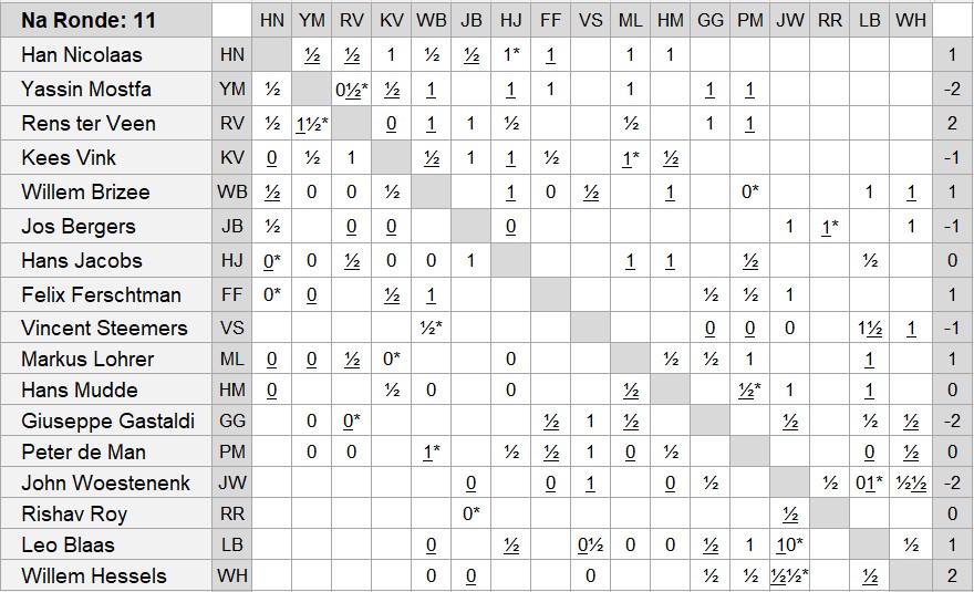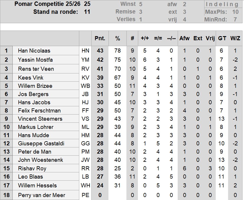 Stand en matrix na de 11e ronde op 13 januari 2026