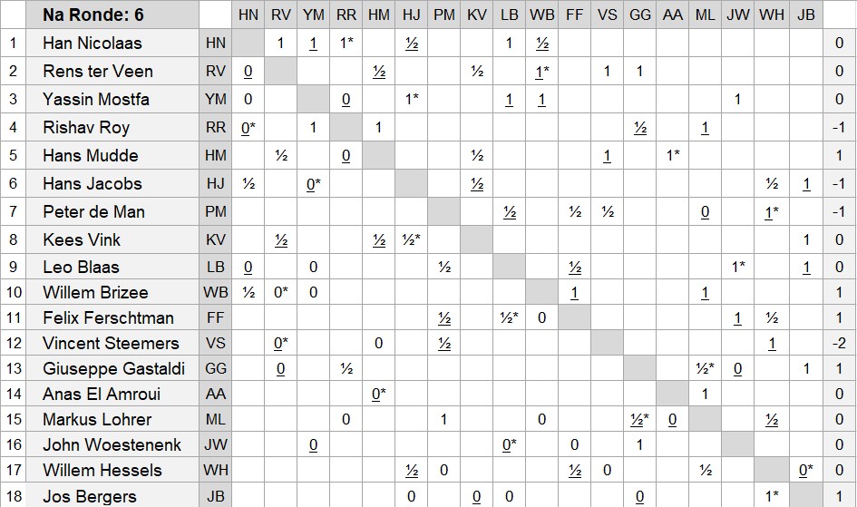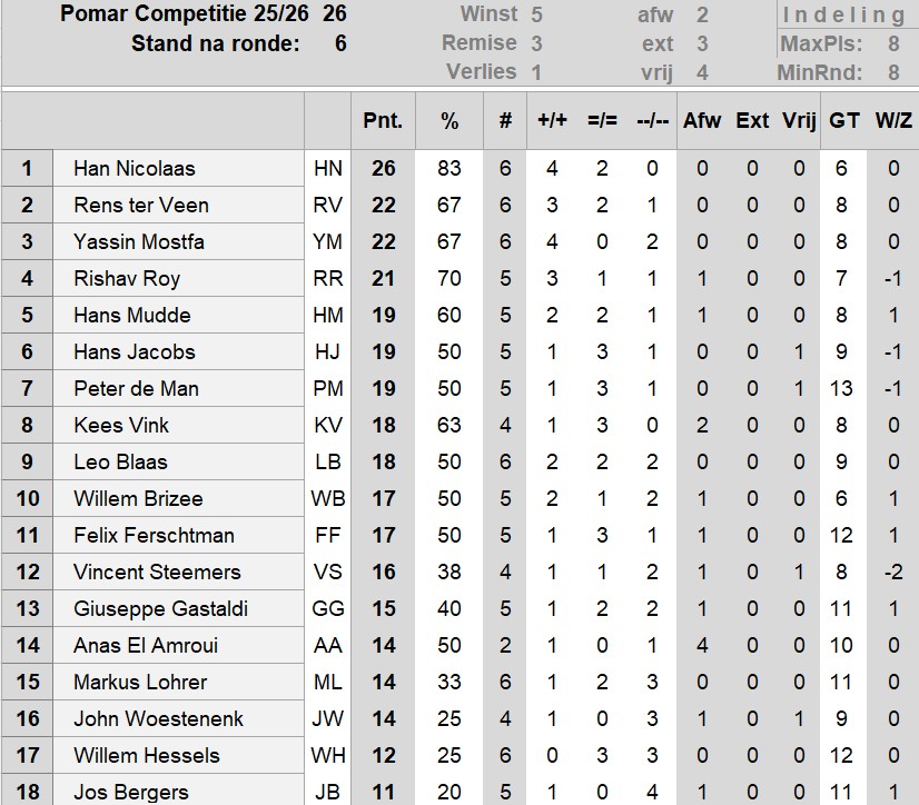 Stand en matrix na de 6e ronde van de voorjaarscompetitie op  31 maart 2026