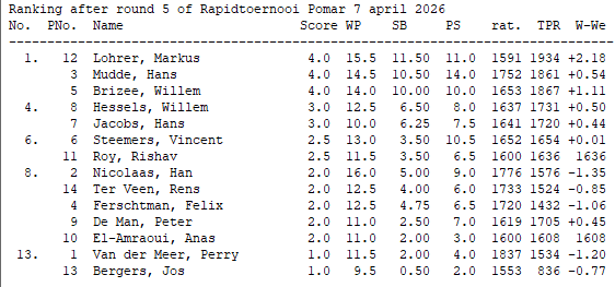 Paas RapidToernooi 2026 Op dinsdag 7 april, de dag na Pasen, speelden we een Paas-rapidtoernooitje van vijf ronden met een speeltempo van 10 minuten en 5 seconden increment. Naast Yassin, Kees, John, Leo en Giuseppe was verder iedereen aanwezig. Het werd een heel gezellige avond. De stukken vlogen soms in het rond maar de sportiviteit stond zoals altijd hoog in het vaandel. Rens, die tevergeefs op zoek was naar de paaseieren, was ook naarstig op zoek naar zijn vorm. Een aantal partijen moest hij het onderspit delven wat hem deed besluiten de theorie nog eens goed te bestuderen (zie foto). Uiteindelijk werd Markus de winnaar van dit toernooi met 4 punten, gevolgd door Hans Mudde en ondergetekende die ook vier punten behaalden. 'In de wandelgangen' werd positief gereageerd op het speeltempo van 10 minuten en 5 seconden per zet. Je hebt dan net iets meer tijd dan bij het veredelde 'houthakken' van 5 minuten speeltempo. Maar hier is niet iedereen het mee eens. Han had nu voor zijn doen heel veel bedenktijd wat hij normaliter niet gewend is. Onder tijdsdruk schaakt hij het beste! Of zijn uiteindelijke, mindere score hiermee te maken had, zal niemand ooit weten... Al met al is een dergelijk toernooi(tje) zeker voor herhaling vatbaar!